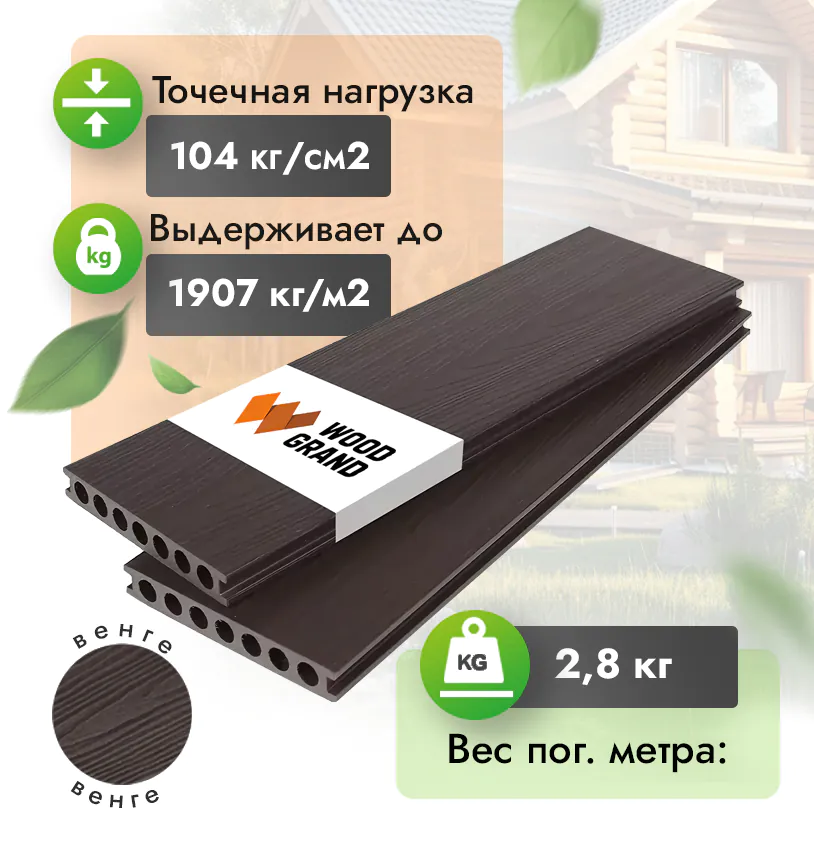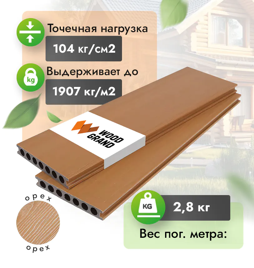 Наш декинг из ДПК выдерживает до 3318 кг/м2, влагостойкий, не требует ухода.